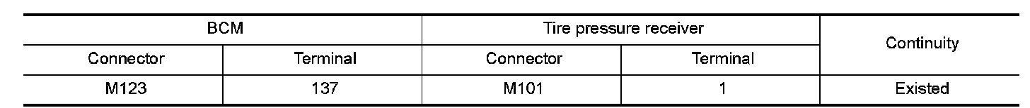 2.Check continuity between BCM harness connector and tire pressure receiver connector.