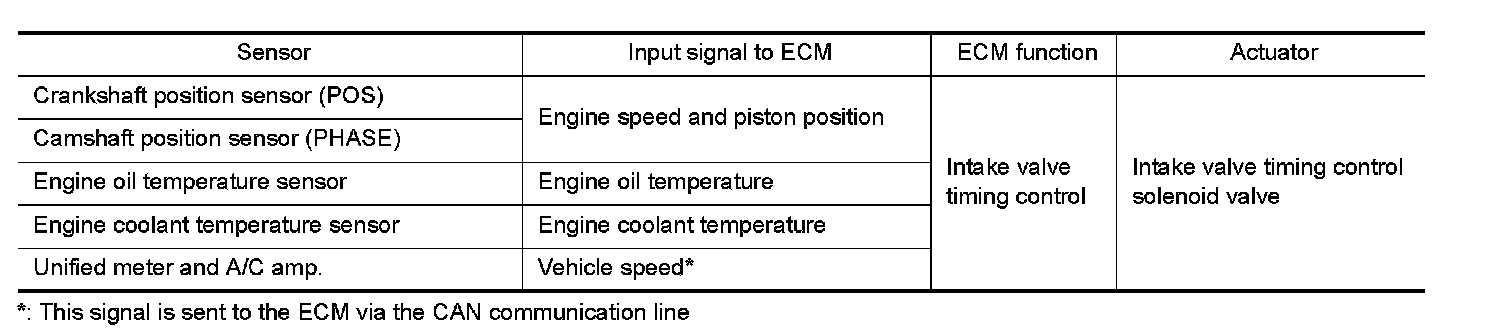 The ECM receives signals such as crankshaft position, camshaft position, engine speed, and engine coolant temperature. Then, the ECM sends ON/OFF pulse duty signals to the intake valve timing (IVT) control solenoid valve depending on driving status. This makes it possible to control the shut/open timing of the intake valve to increase engine torque in low/mid speed range and output in high-speed range.