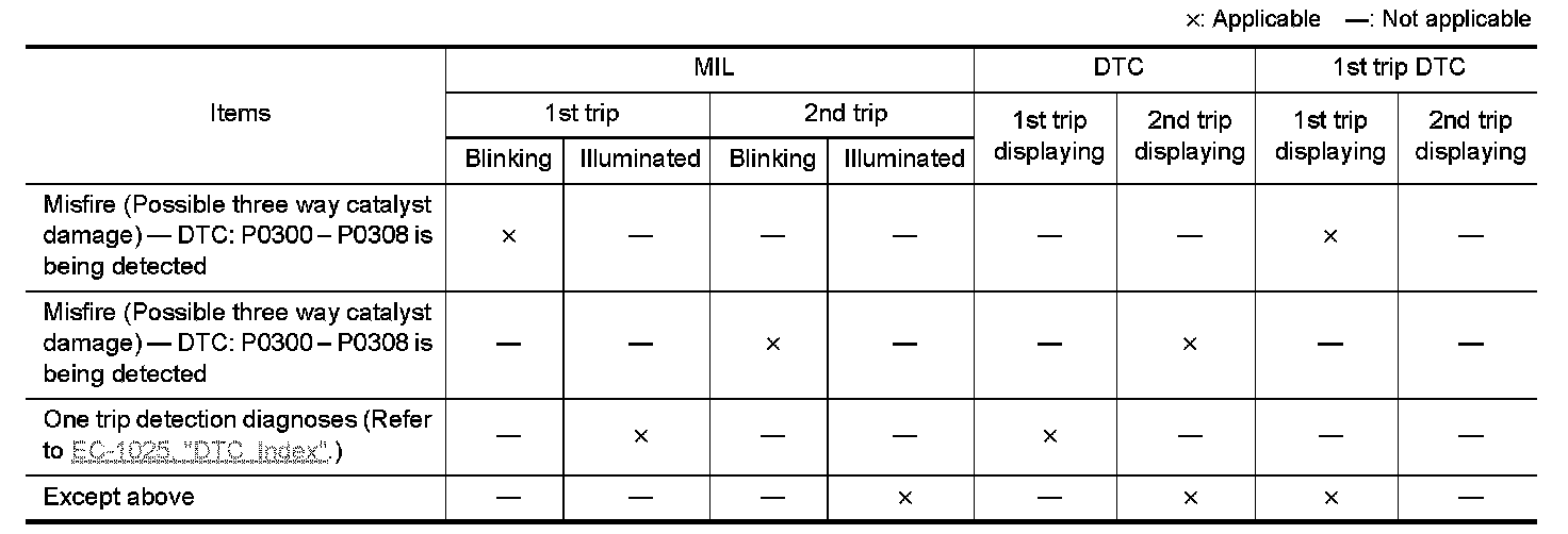 [2nd trip] The "trip" in the "Two Trip Detection Logic" means a driving mode in which self-diagnosis is performed during vehicle operation. Specific on board diagnostic items will cause the ECM to illuminate or blink the MIL, and store DTC and Freeze Frame data, even in the 1st trip, as shown below.