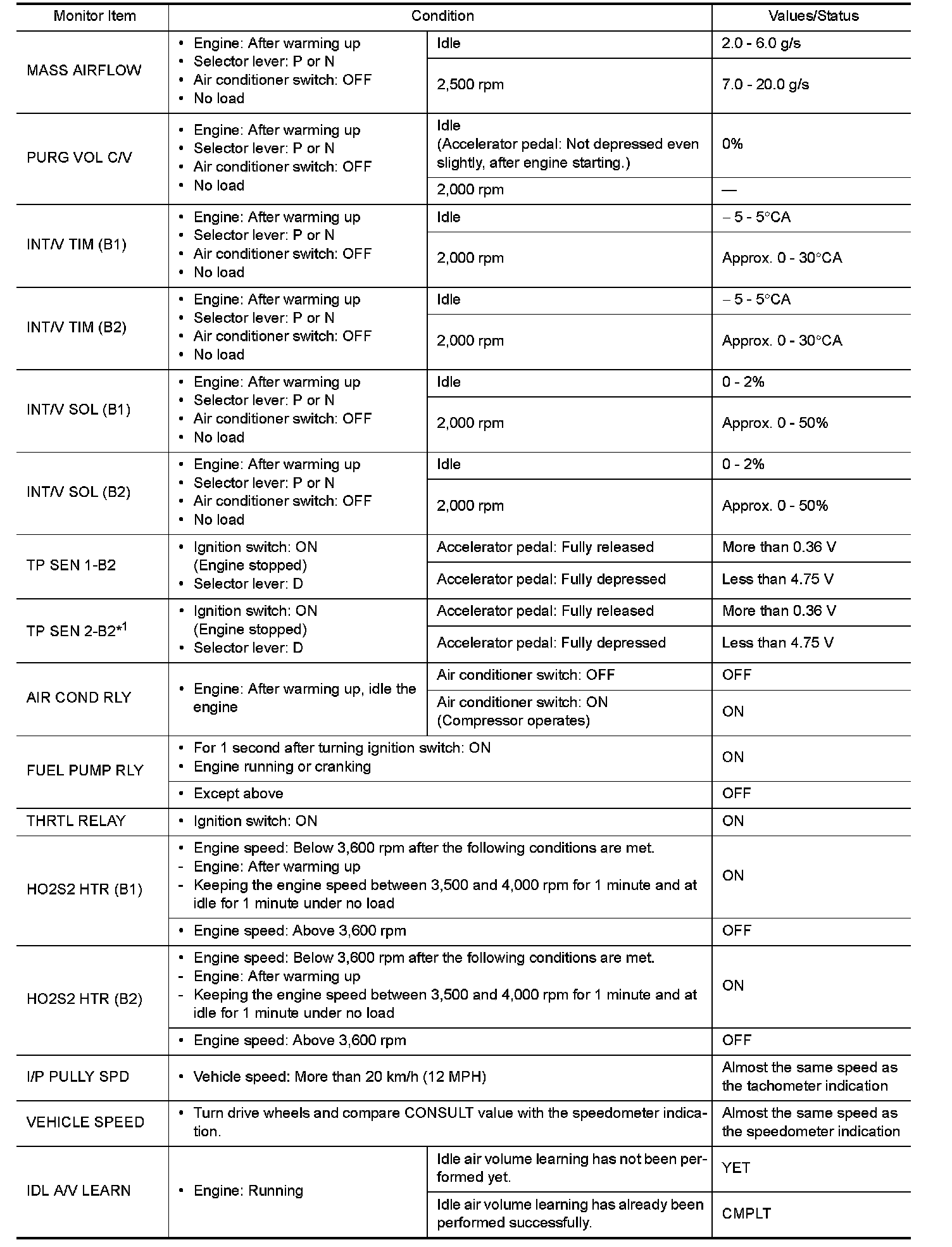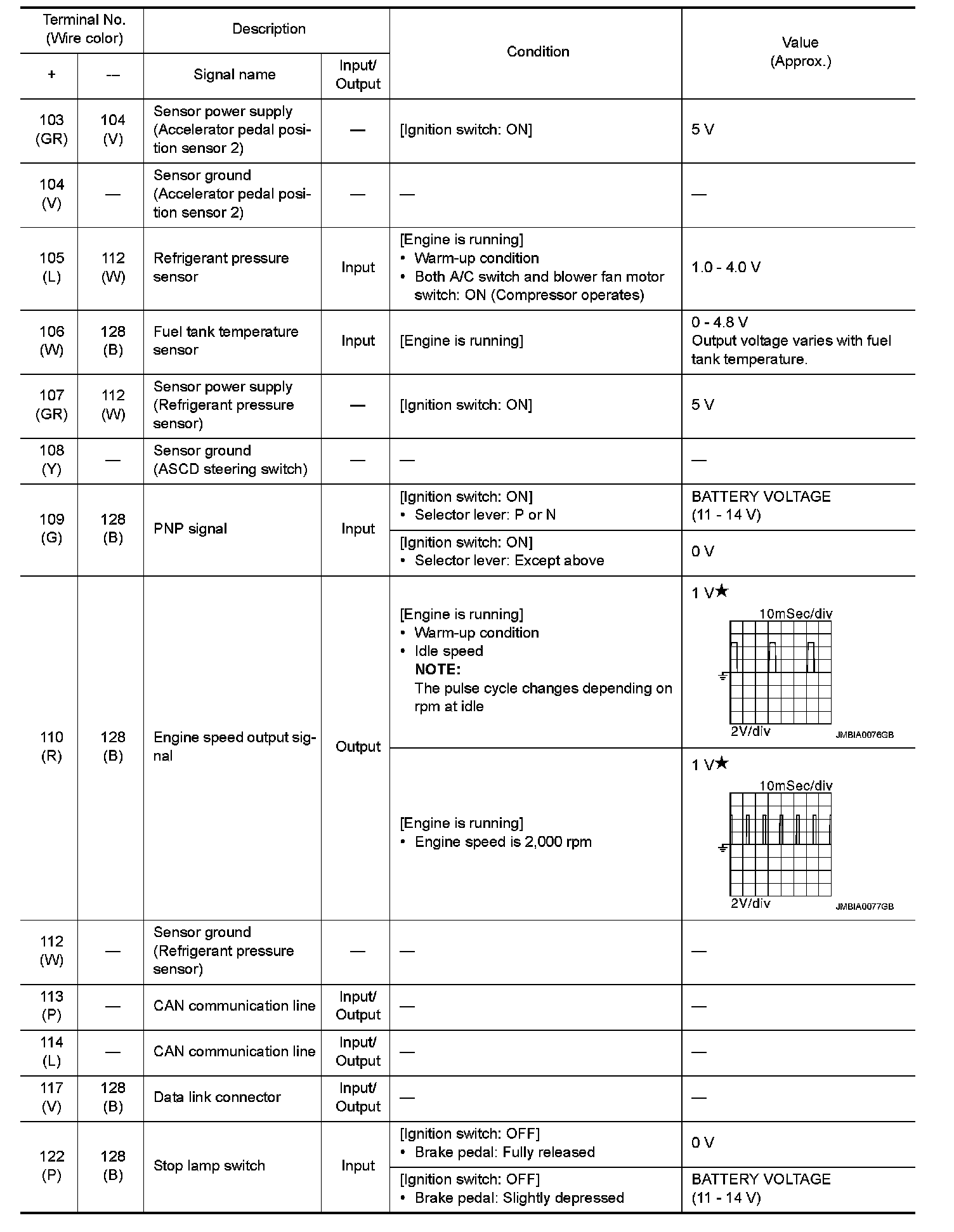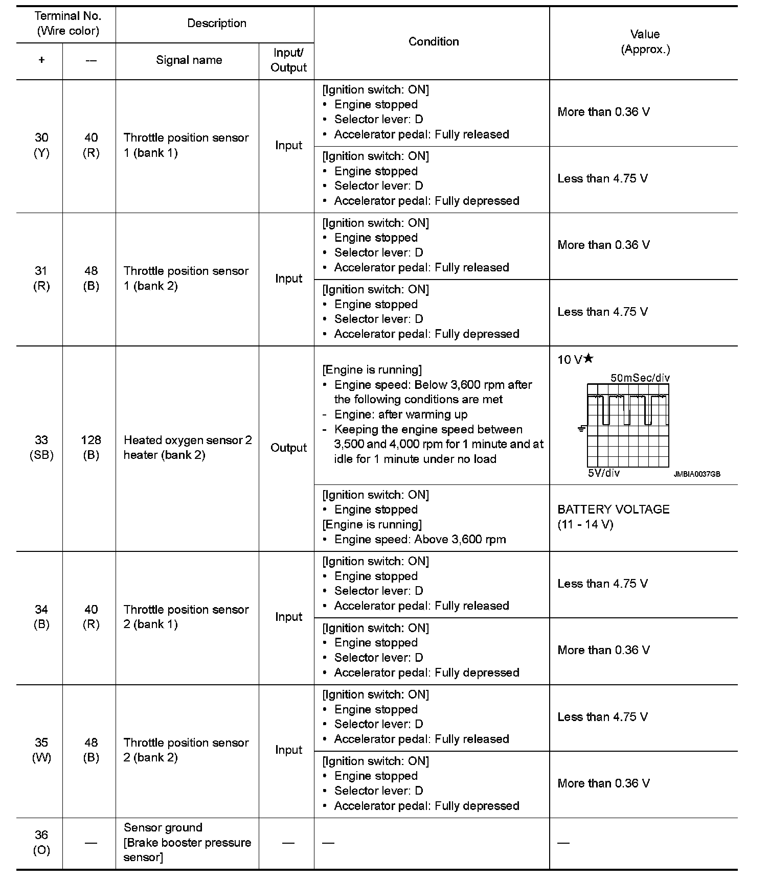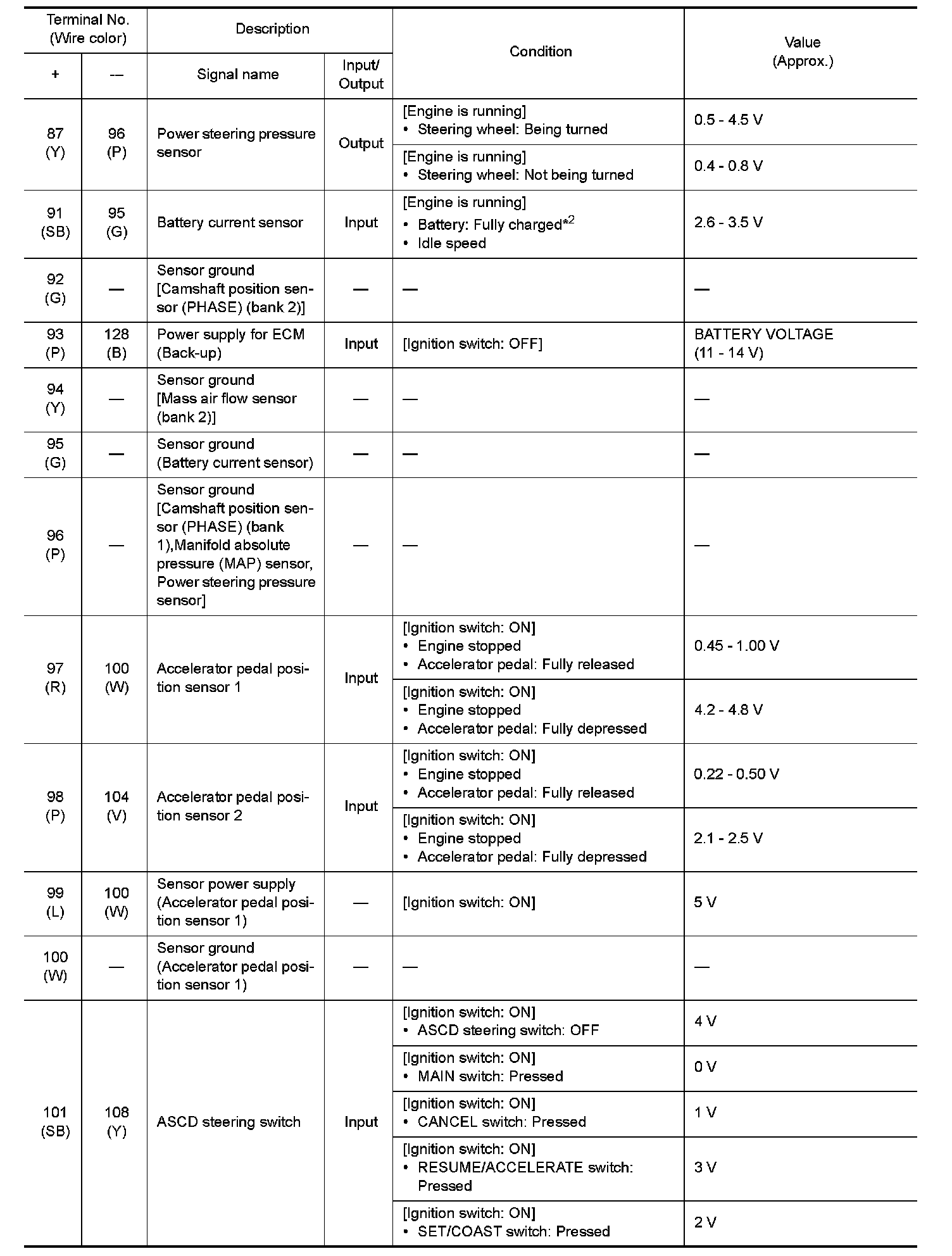 *1: Accelerator pedal position sensor 2 signal and throttle position sensor 2 signal are converted by ECM internally. Thus, they differ from ECM terminals voltage signal.