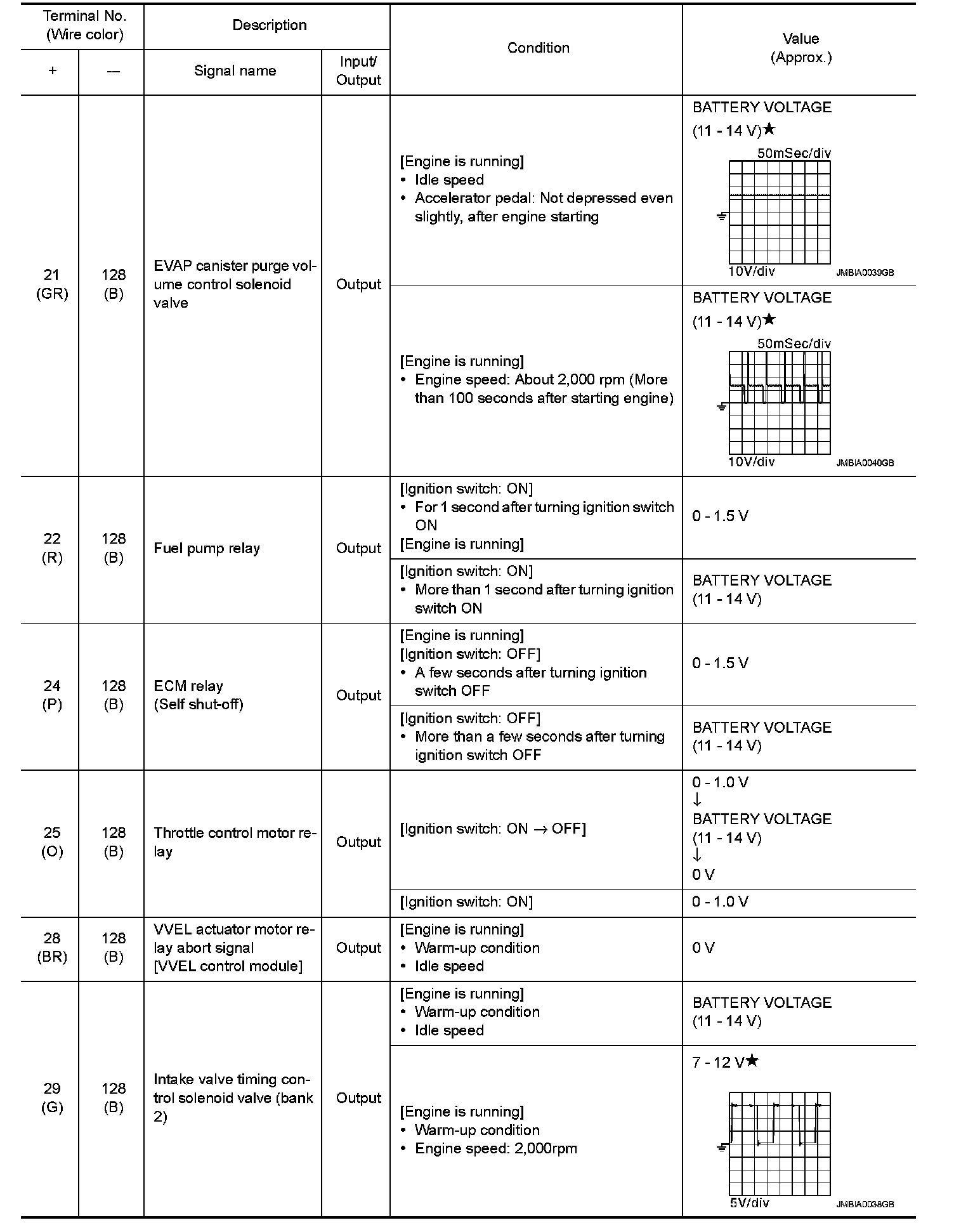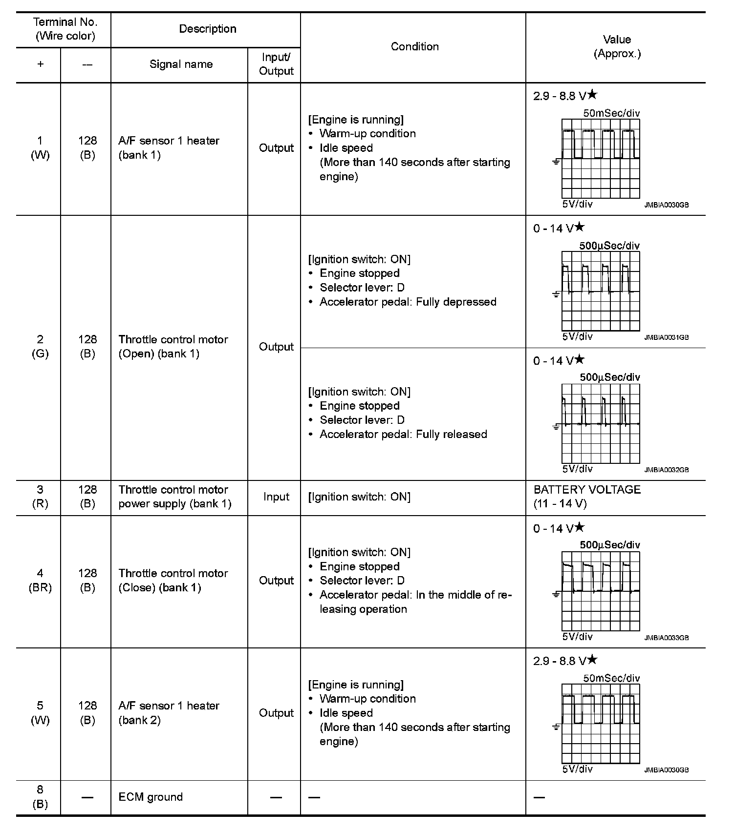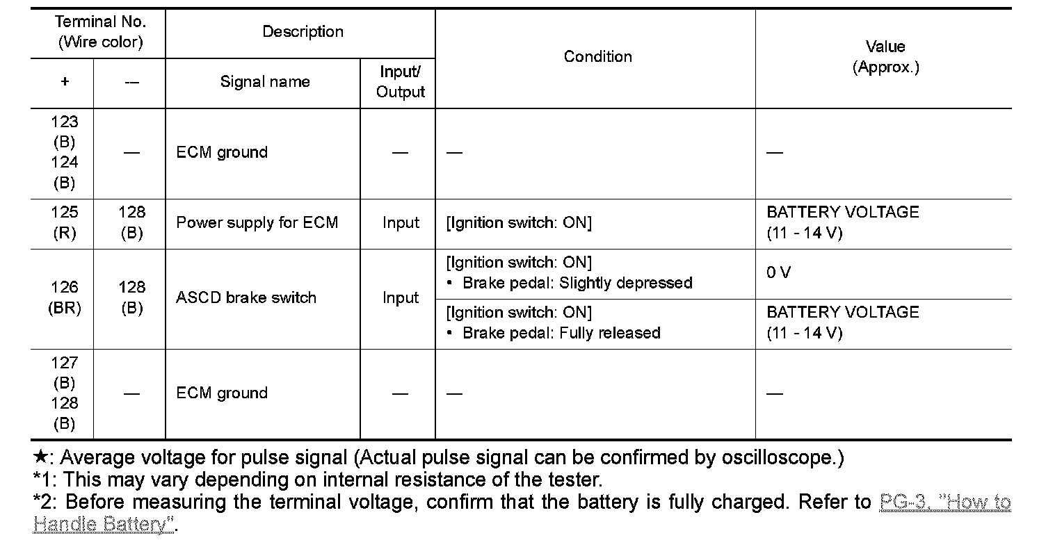 *1: Accelerator pedal position sensor 2 signal and throttle position sensor 2 signal are converted by ECM internally. Thus, they differ from ECM terminals voltage signal.