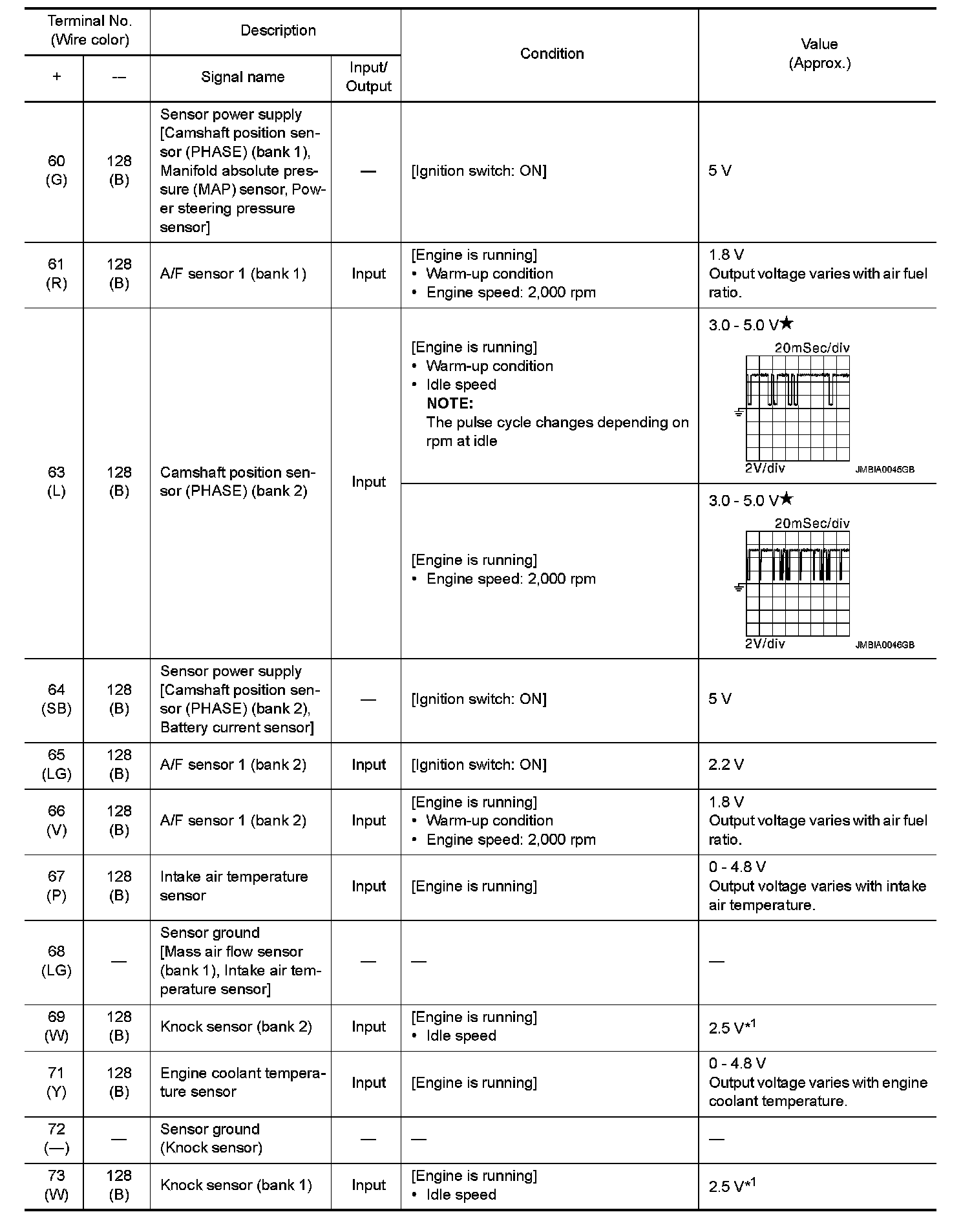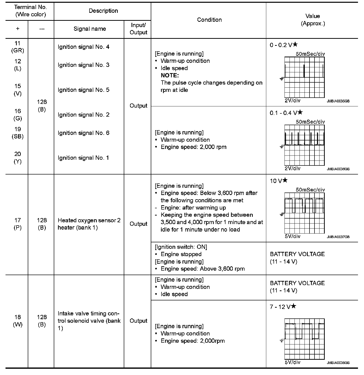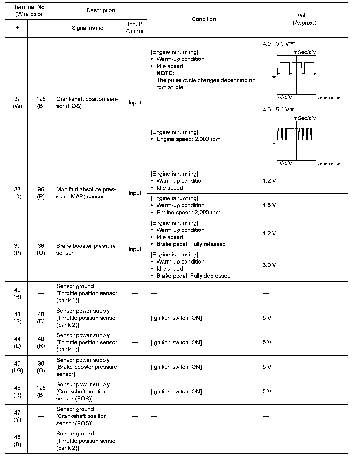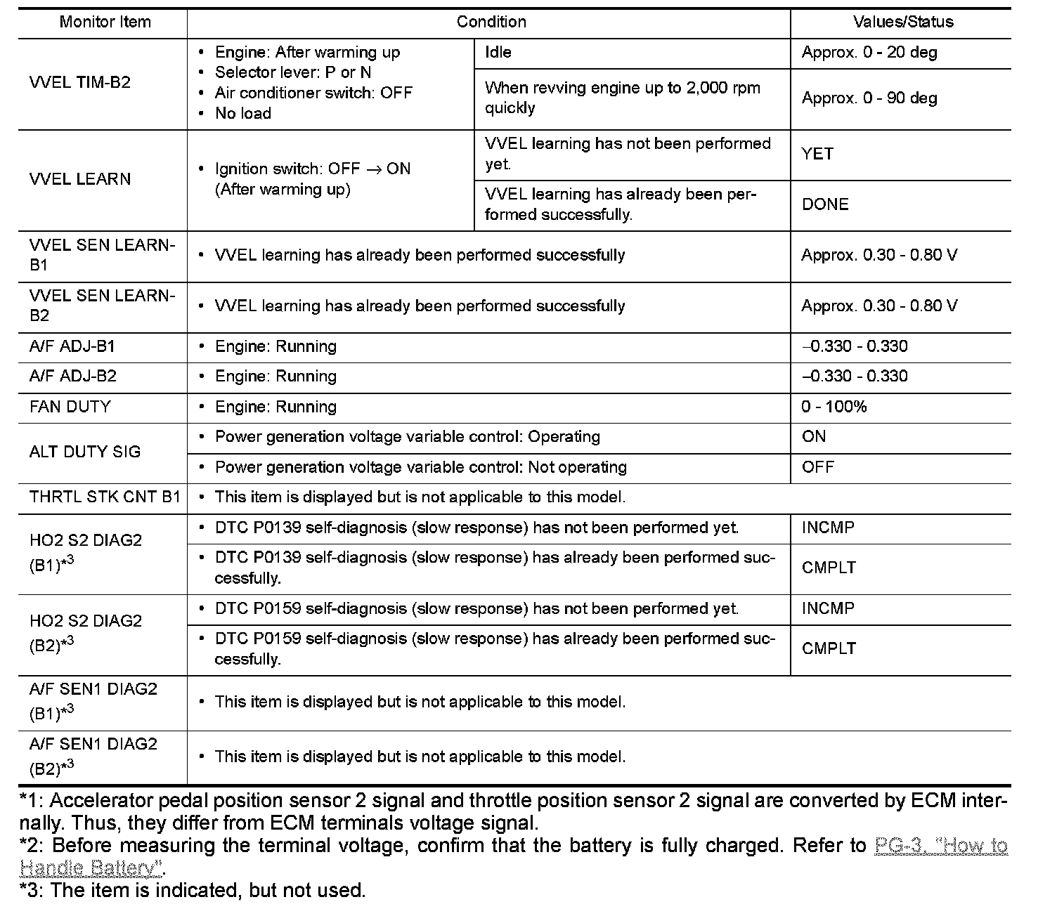 *1: Accelerator pedal position sensor 2 signal and throttle position sensor 2 signal are converted by ECM internally. Thus, they differ from ECM terminals voltage signal.