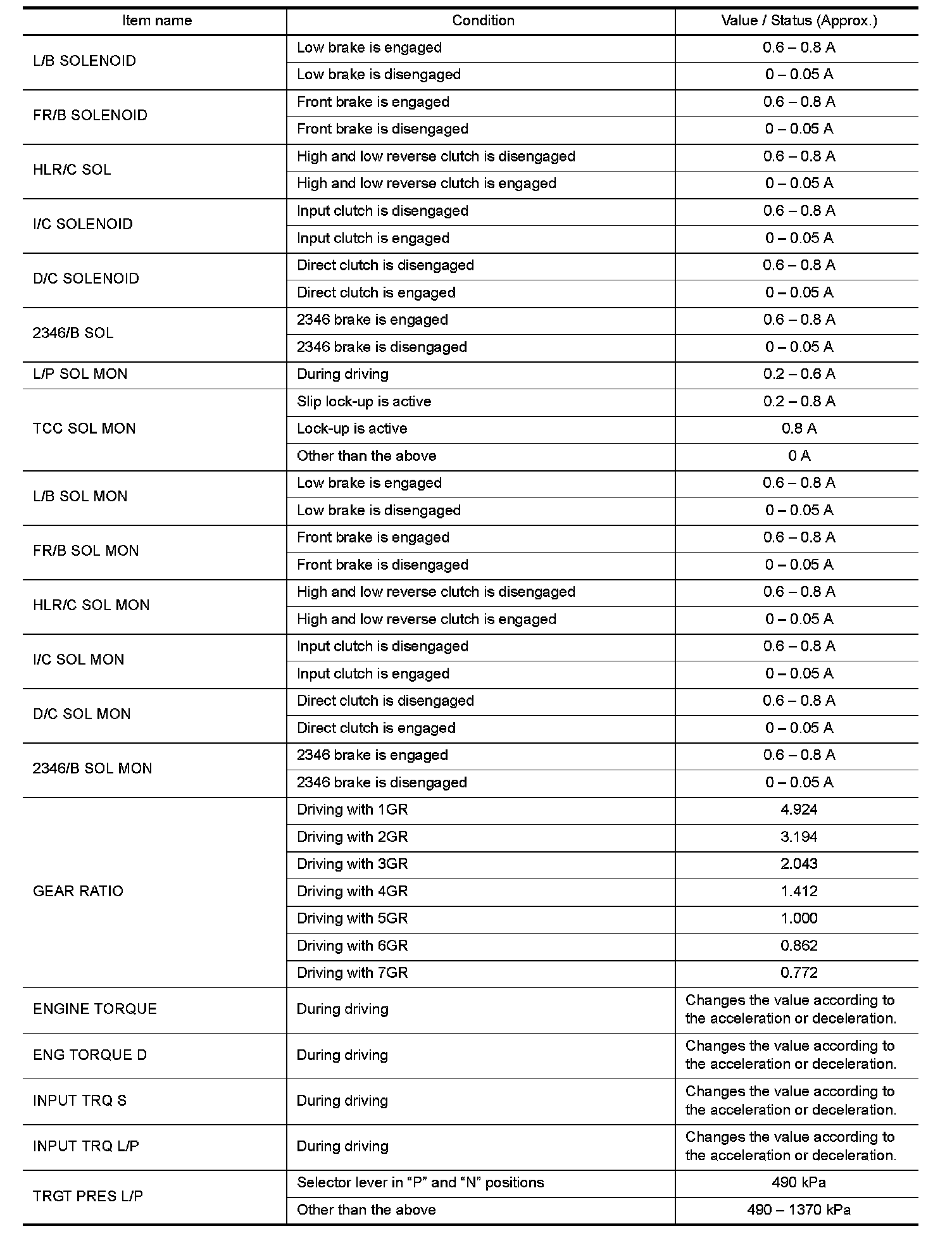 4.Display of solenoid valves on CONSULT changes at the start of shifting, while gear position is displayed upon completion of shifting (which is computed by TCM).