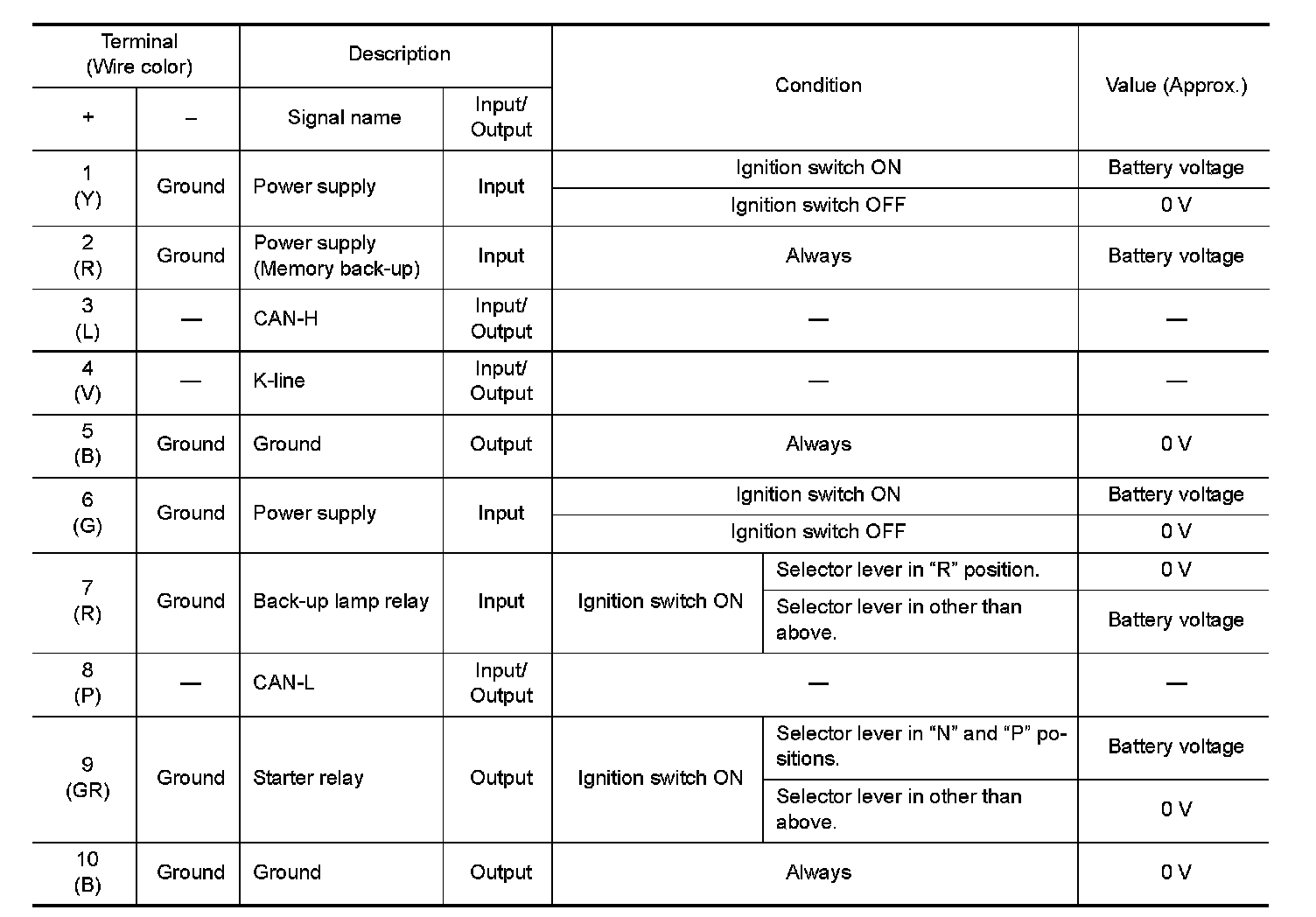 Pinout Values and Diagnostic Parameters