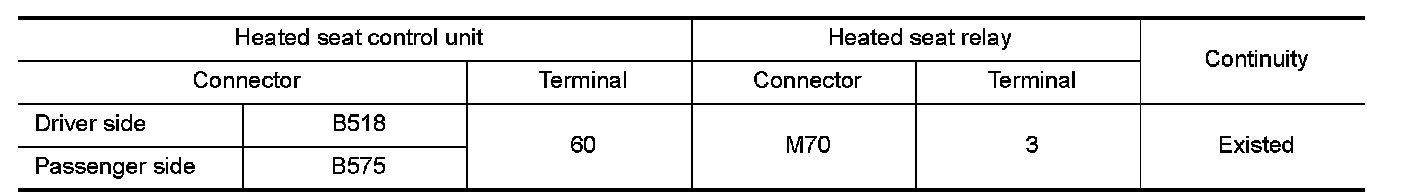 3.Check continuity between heated seat control unit harness connector and heated seat relay terminal connector.