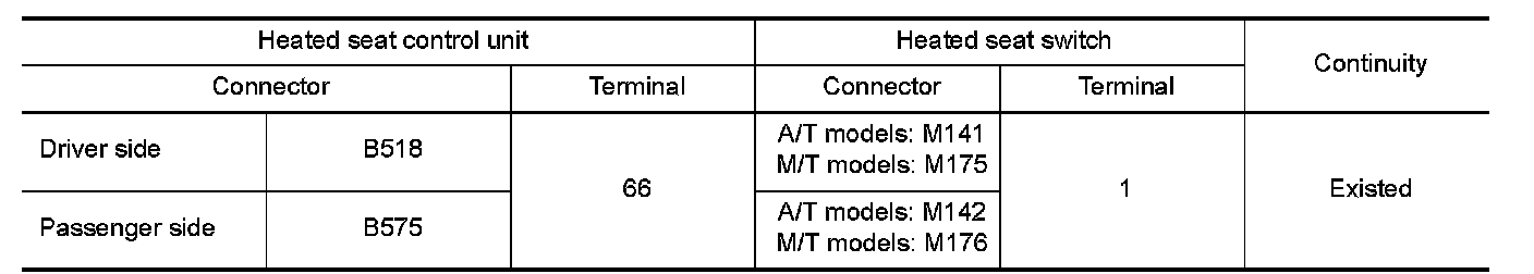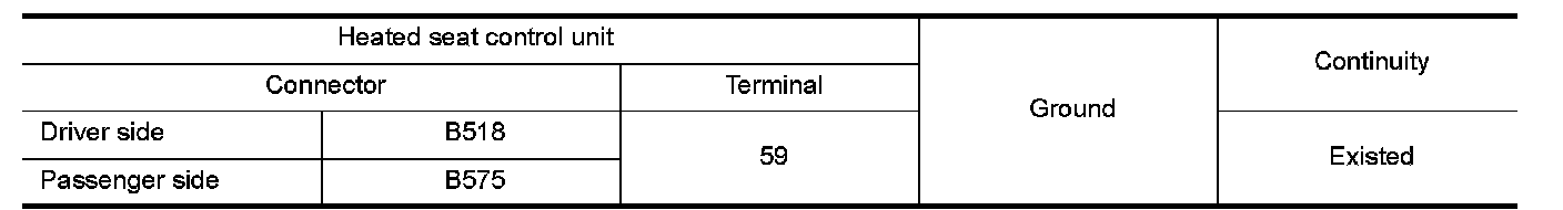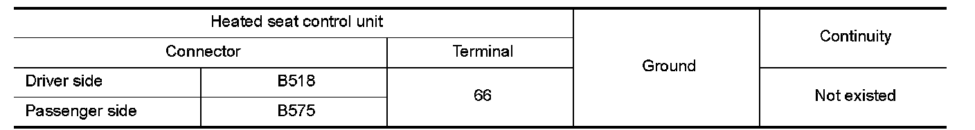 3.Check continuity between heated seat control unit harness connector and heated seat switch harness connector.