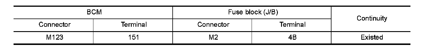 3.Check continuity between BCM harness connector and fuse block (J/B) harness connector.