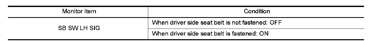 When checking "SB SW LH SIG" on DATA MONITOR screen, check that ON/OFF display changes synchronized with the insertion operation to the seat belt buckle.