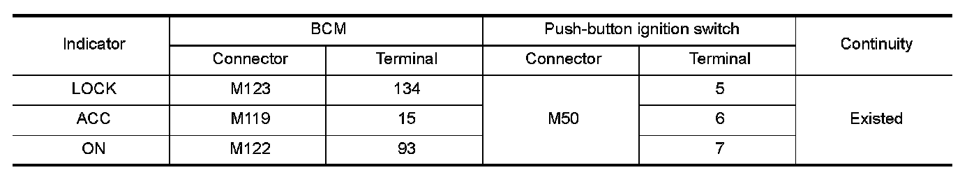 Check push-button ignition switch ("LOCK INDICATOR", "ACC INDICATOR" and "IGNITION ON IND") in