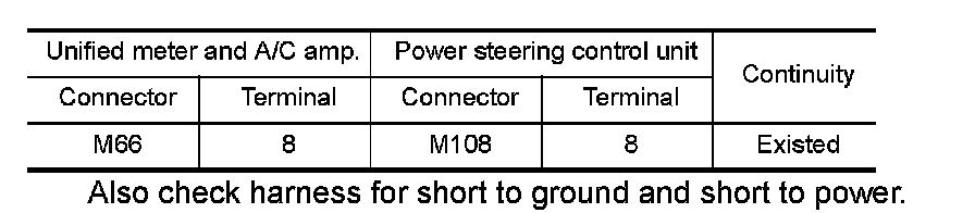 4.Check the continuity between unified meter and A/C amp. harness connector and power steering control unit harness connector.