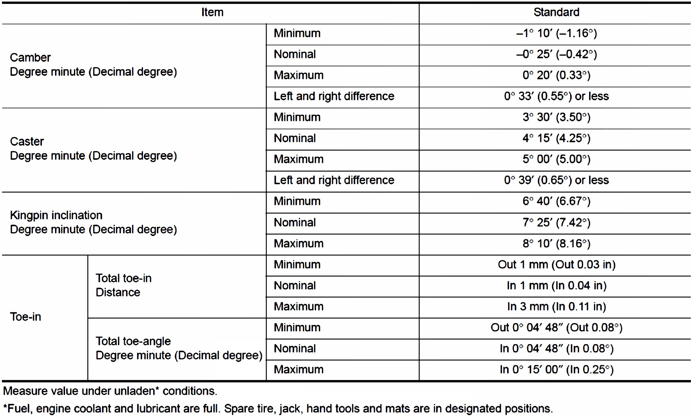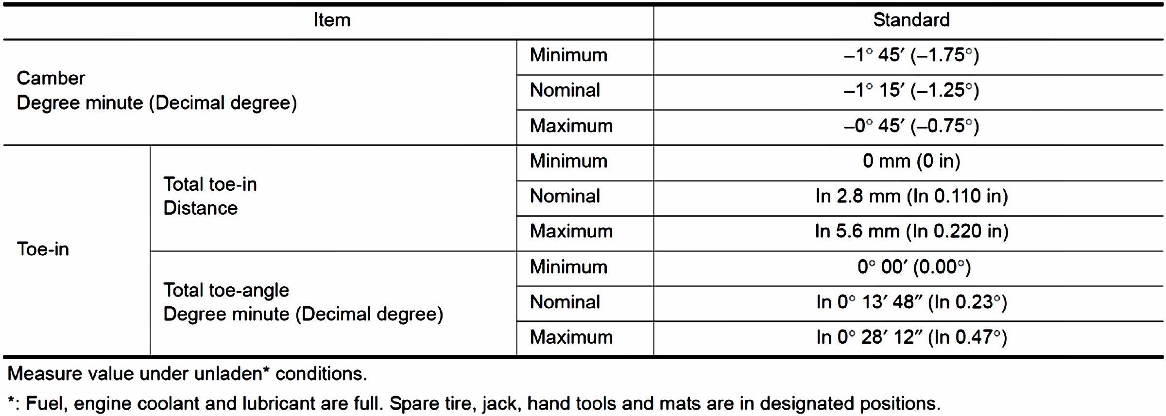 Wheel Alignment Specifications