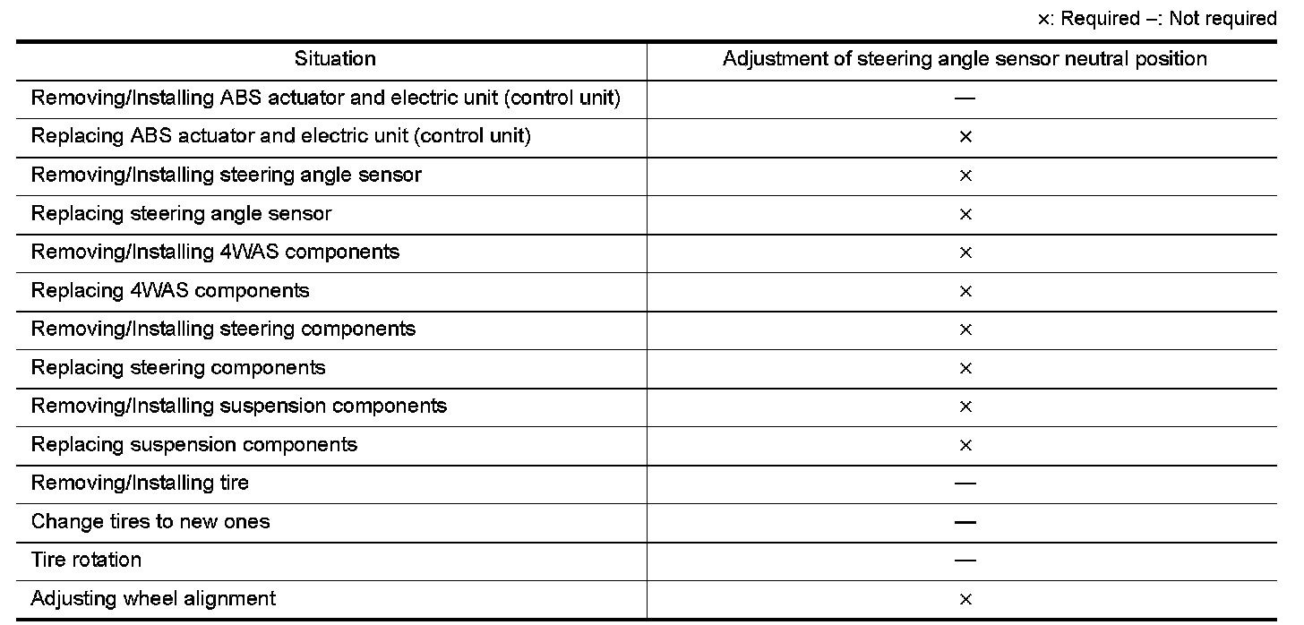 When doing work that applies to the list below, make sure to adjust neutral position of steering angle sensor before running vehicle.