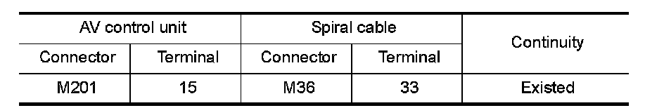2.Check continuity between AV control unit harness connector and spiral cable harness connector.