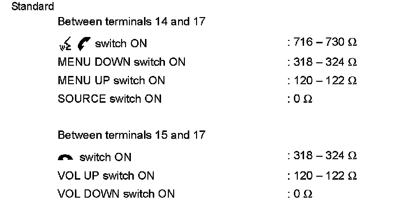Measure the resistance between the steering switch connector terminals 14 to 17 and 15 to 17.