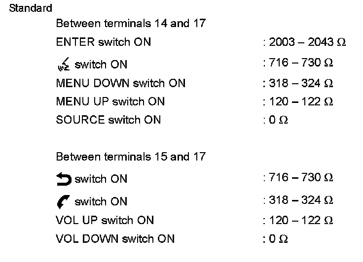 Measure the resistance between the steering switch connector terminals 14 to 17 and 15 to 17.