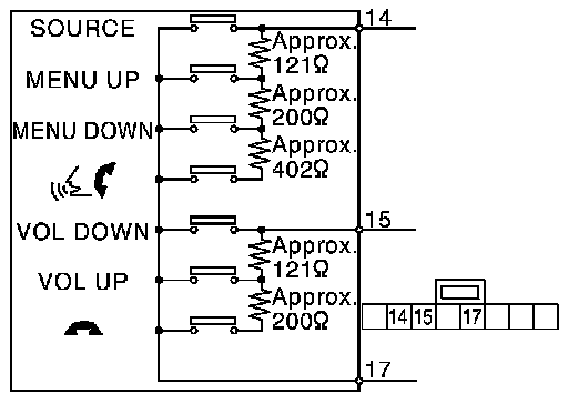 Measure the resistance between the steering switch connector terminals 14 to 17 and 15 to 17.