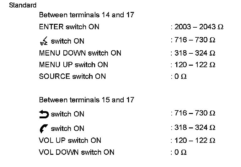 Measure the resistance between the steering switch connector terminals 14 to 17 and 15 to 17.