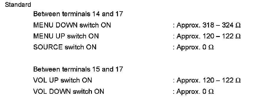 Measure the resistance between the steering switch connector terminals 14 to 17 and 15 to 17.