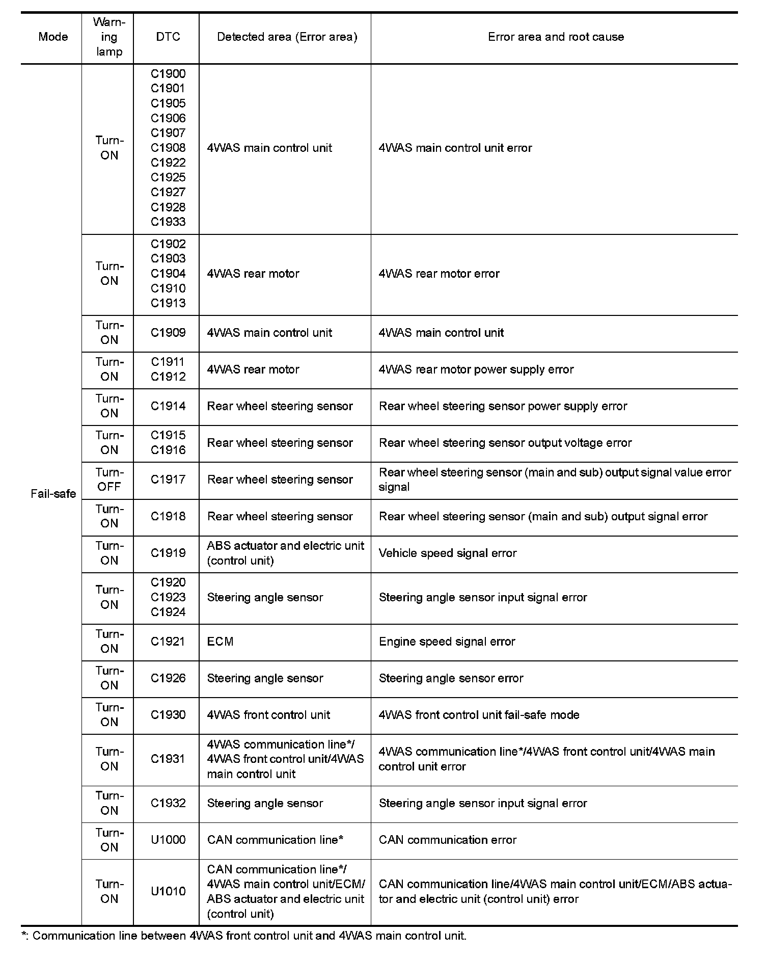 - EPS system (4WAS main control unit) enters the fail-safe mode (that allows the steering force to be controlled without impairing the drive ability) if the input from each sensor is not within the specified range. Then, 4WAS warning lamp turns ON.