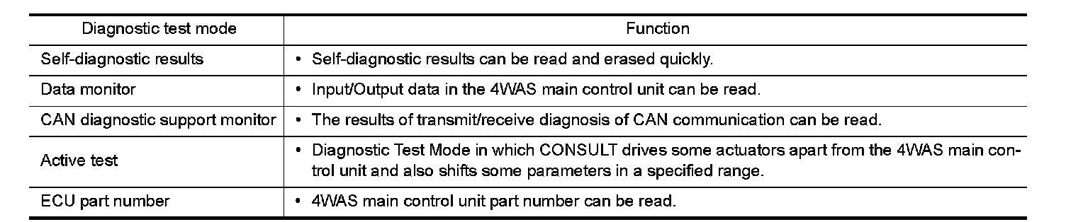 - The control signal forcibly activates (ON/OFF) 4WAS rear assembly, performs the self-diagnosis and checks each sensor in "SELF DIAGNOSTIC MODE".
