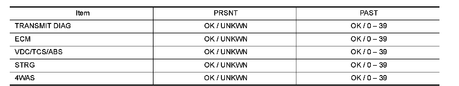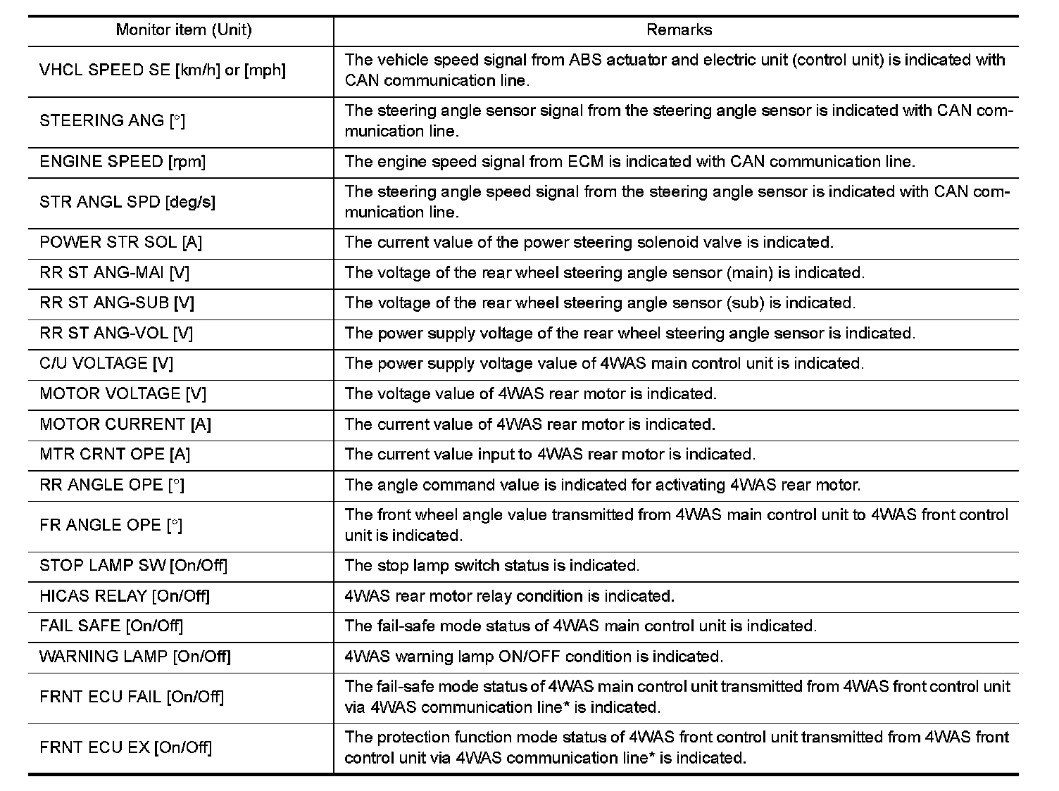 - The communication status and the number of errors of 4WAS main control unit, ECM, ABS actuator and electric unit (control unit), 4WAS front control unit and the steering angle sensor are indicated.