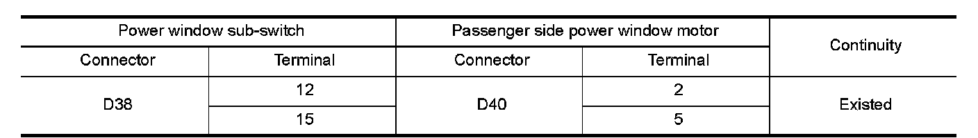 3.Check continuity between power window sub-switch harness connector and passenger side power window motor harness connector.