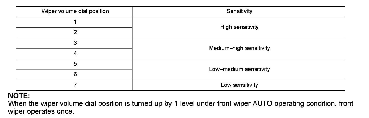 BCM determines rain sensor sensitivity according to wiper volume dial position.