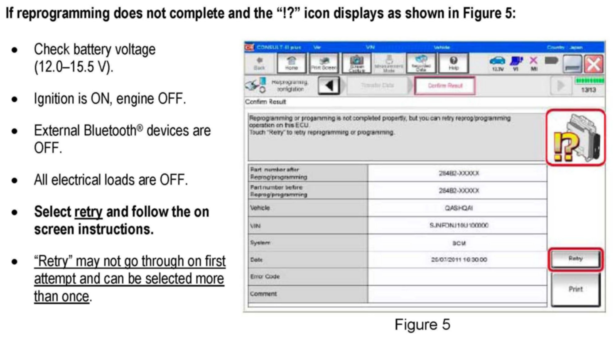 If reprogramming does not complete and the "!?" icon displays as shown in Figure 5 and the information shown above.