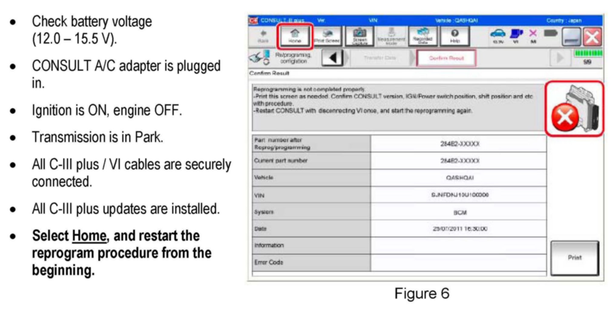 If reprogramming does not complete and the "X" icon displays as shown in Figure 6 and the information shown above.