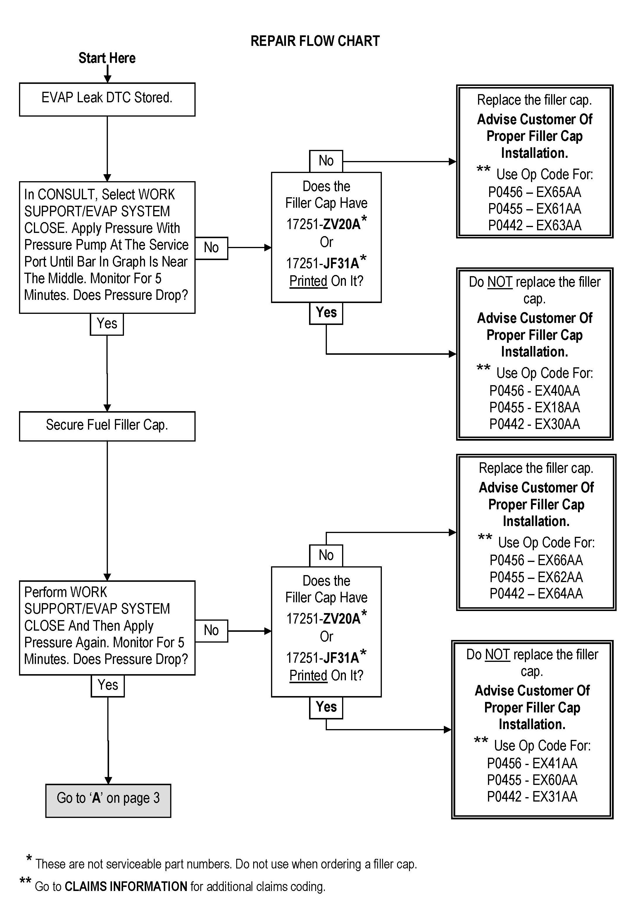 If one or more DTCs listed below related to EVAP system leaks is found stored in Self Diagnosis use the REPAIR FLOW CHART. Use the EVAP system diagram for reference.