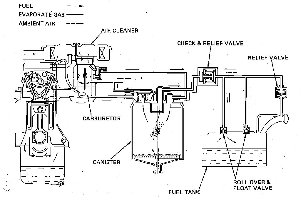 The evaporative emission control system on these vehicles, Fig. 11 is designed to direct raw fuel vapors from the fuel tank and carburetor into the charcoal canister. These vapors are mixed with ambient air and are then routed to the intake manifold to be burned during engine operation. The system consists of roll over and float valves, a relief valve, a check and relief valve, a vent switching valve and a charcoal canister.