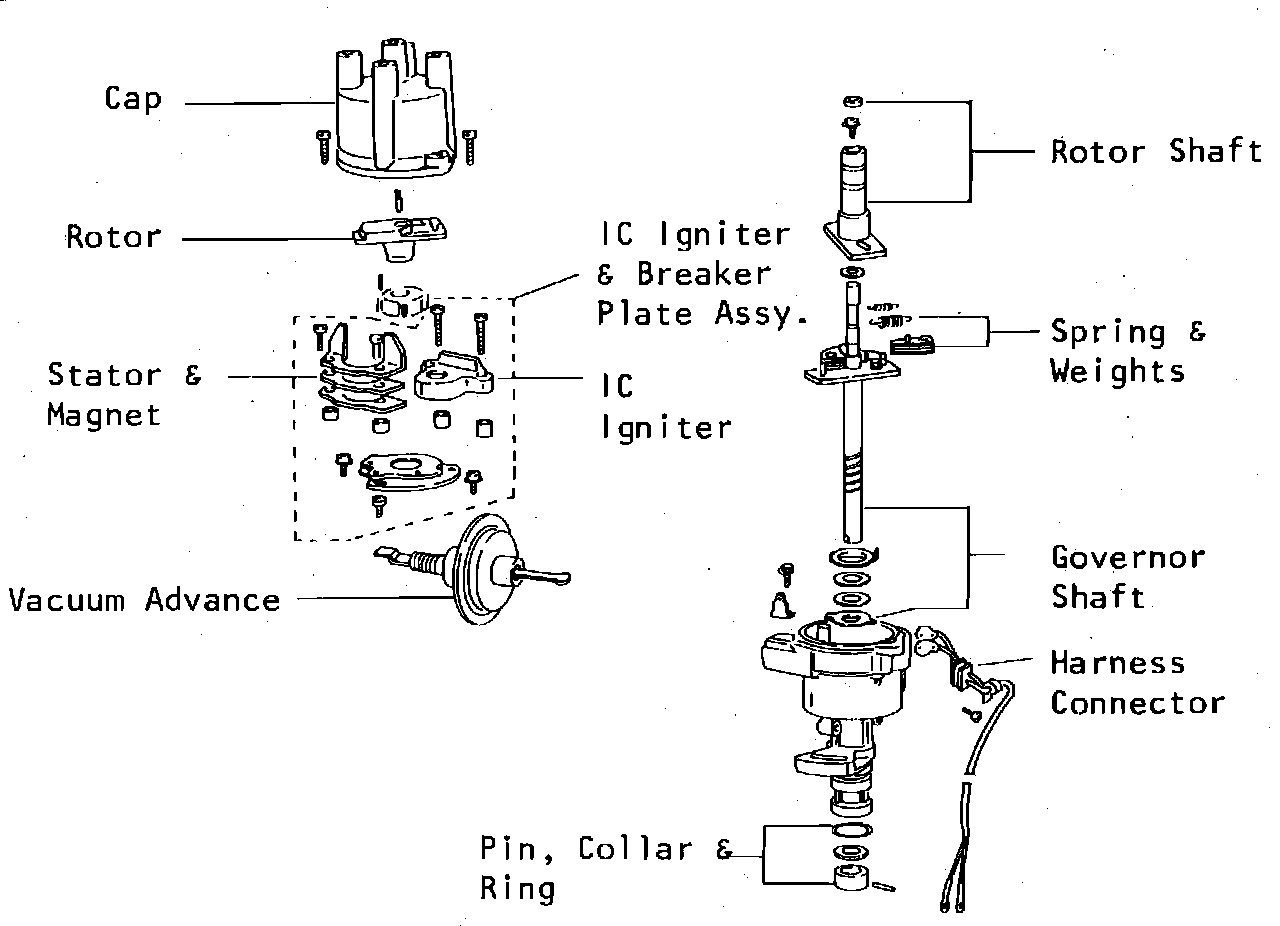 Refer to Fig. 8, during disassembly procedure. 1. Apply alignment marks on distributor and cylinder head, then remove distributor assembly from engine.