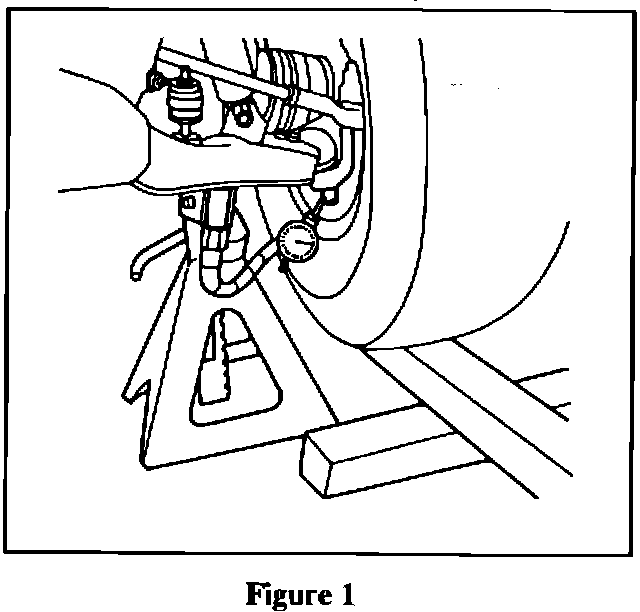 a. Attach a dial gauge and stand to the lower control arm. Position the dial gauge parallel to the lower ball joint assembly, with the gauge touching the tip of the threaded portion of the ball joint stud. See Figure 1.
