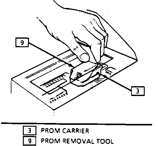 Using the rocker-type PROM removal tool, engage one end of the PROM carrier with the hook end of the tool. Press on the vertical bar end of the tool and rock the engaged end of the PROM carrier up as far as possible. Engage the opposite end of the PROM carrier in the same manner and rock this end up as far as possible. Repeat this process until PROM and carrier are free from the socket. Use of other than the tool specifically made for this task may damage the PROM or its socket.