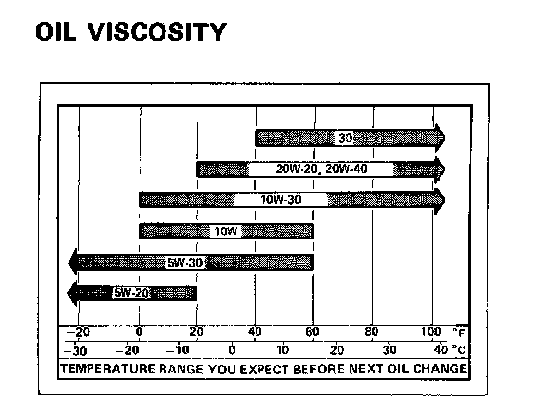 The chart lists the engine oil viscosities recommended for the temperature range you expect before the next oil change.