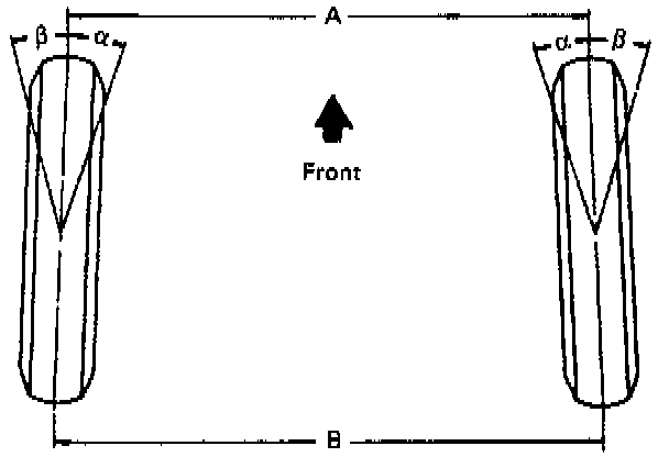 Toe-in is the turning of the front wheels. The actual amount of toe-in is normally a fraction of a degree. Toe-in is measured from the center of the tire treads or from the inside of the tires. The purpose of toe-in is to insure parallel rolling of the front wheels and to offset any small deflections of the wheel support system which occurs when the vehicle is rolling forward. Incorrect toe-in results in excessive toe-in and unstable steering. Toe-in is the last alignment to be set in the front end alignment procedure.