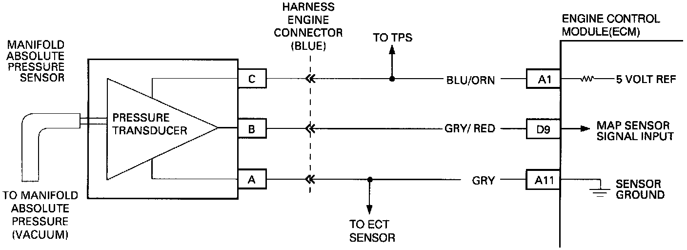 Manifold Absolute Pressure (MAP) Sensor measures the changes in the Intake MAP which result from Engine load (Intake Manifold vacuum) and revolution per minute changes; and converts these into a voltage output. The Engine Control Module (ECM) sends a 5-volt reference voltage to the MAP Sensor. As the MAP changes, the output voltage of the Sensor also changes. By monitoring the Sensor output voltage, the ECM knows the MAP. A lower pressure (low voltage) output voltage will be about 1 - 2 volts at idle. While higher pressure (high voltage) output voltage will be about 4 - 4.8 at Wide Open Throttle. The MAP Sensor is also used, under certain conditions, to measure Barometric Pressure, allowing the ECM to make adjustment for different altitudes. The ECM uses the MAP Sensor to control Fuel delivery and Ignition timing.