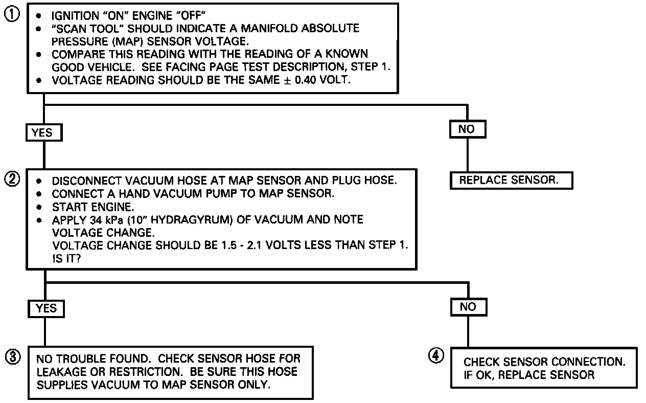 2. Applying 34 kPa (10" hydragyrum) vacuum to the MAP Sensor should cause the voltage to be 1.5 - 2.1 volts less than the voltage at Step 1. Upon applying vacuum to the Sensor, the change in voltage should be instantaneous. A slow voltage change indicates a faulty Sensor.