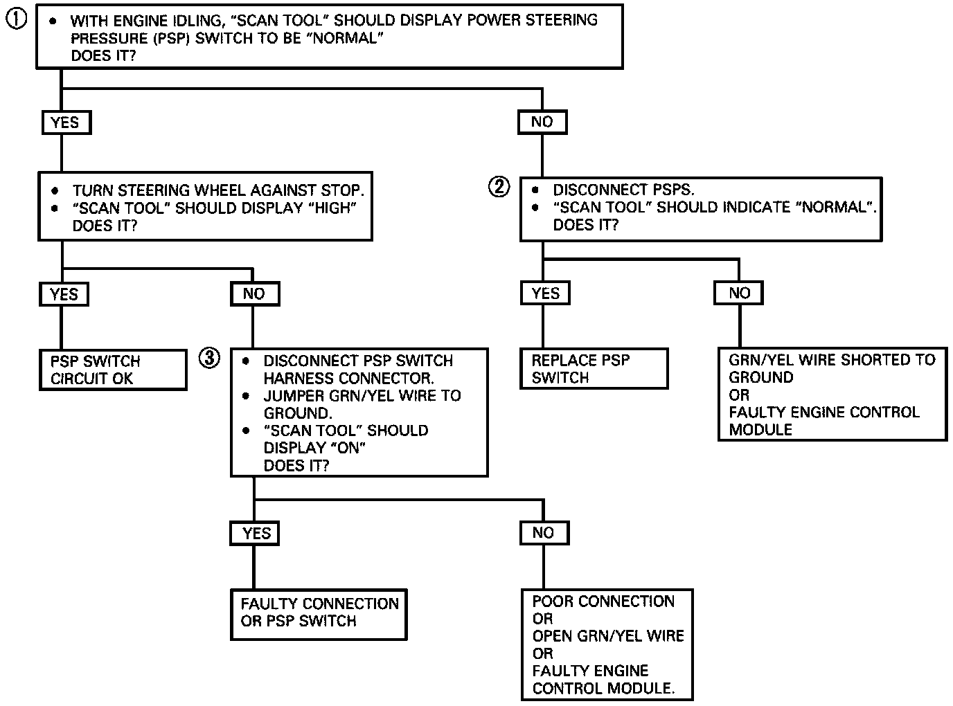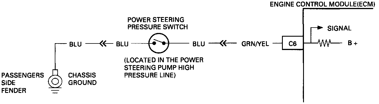 The Power Steering Pressure (PSP) Switch is normally open to ground, and GRN/YEL wire will be near the Battery positive voltage. Turning the Steering Wheel increases Power Steering oil pressure and its load on an idling Engine. The Pressure Switch will close before the load can cause an idle problem. Closing the Switch causes GRN/YEL wire to read less than 1 volt. The Engine Control Module (ECM) will increase the idle air rate and disengage the Air Conditioning relay.