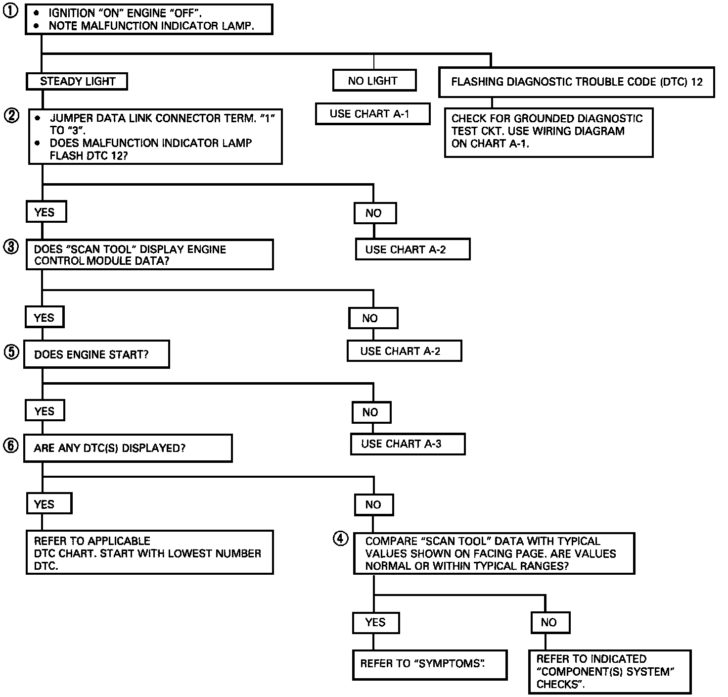 The On-Board Diagnostic System Check is an organized approach to identifying a problem created by an Electronic Engine Control System malfunction. It must be the starting point for any driveability complaint diagnosis, because it directs the service technician to the next logical step in diagnosing the complaint. Understanding the chart and using it correctly will reduce diagnostic time and prevent the unnecessary replacement of good parts.Test Description