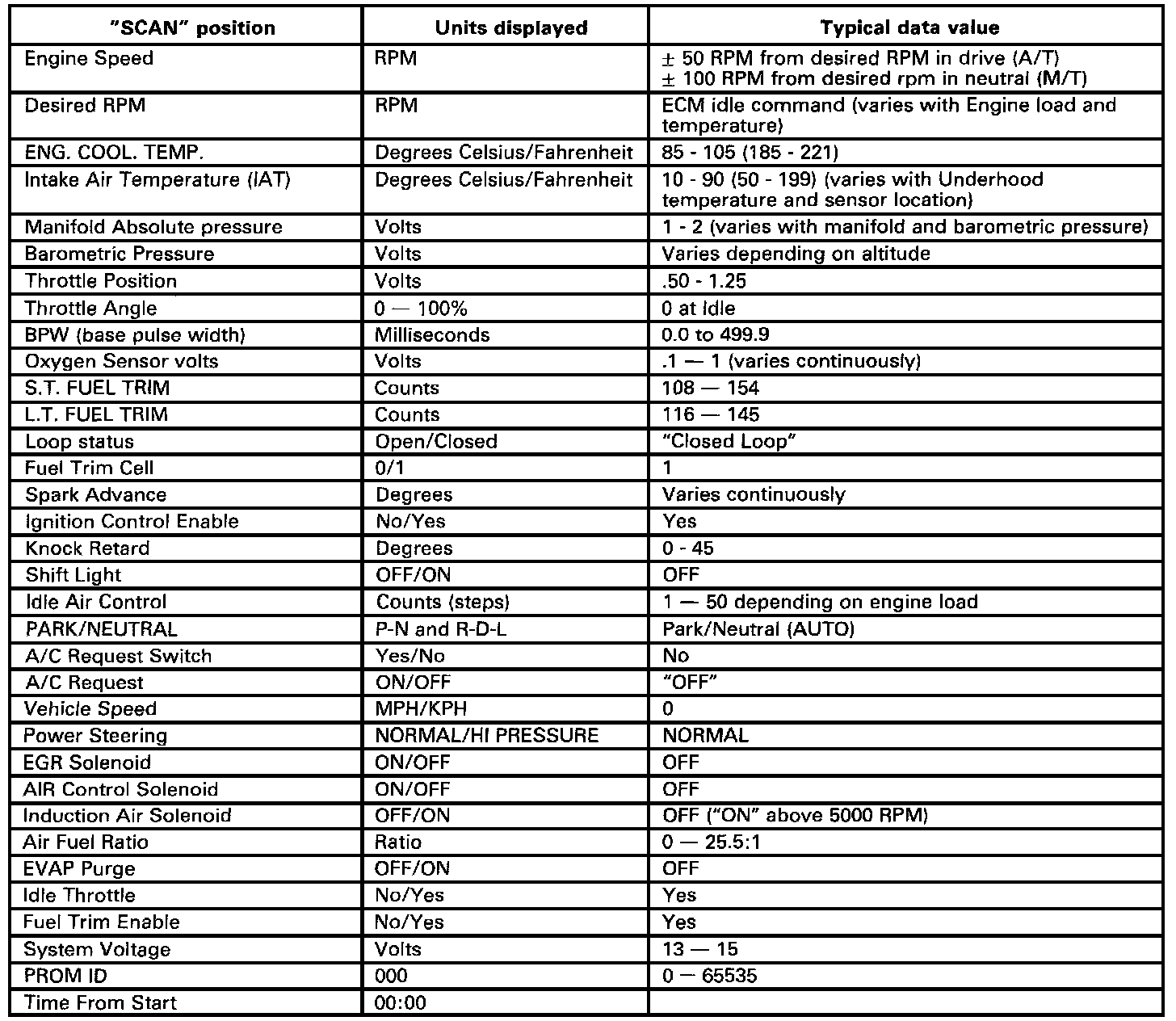 The Diagnostic Circuit is an organized approach to identifying a problem created by an Electronic Engine Control System malfunction. It must be the starting point for any drive ability complaint diagnosis, because it directs the service technician to the next logical step in diagnosing the complaint.The "Scan Tool" data listed in the table may be used for comparison, after completing the On-Board Diagnostic System Check and finding the On-Board Diagnostics functioning properly with no trouble codes displayed. The "Typical Data Values" are an average of display values recorded from normally operating Vehicles and are intended to represent what a normally functioning system would typically display.