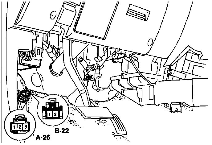 NOTE: If you clear the Diagnosis Trouble Codes (DTCs) you will not be able to read any codes recorded during the last trouble. To be able to use the DTC again to identify a problem you will need to reproduce the fault or the problem. This may require a new test drive or just turn the Ignition "ON" (this depends on the nature of the fault).1. Short the Diagnosis Connector B-22 Terminal 1 to Terminal 2 (ground).