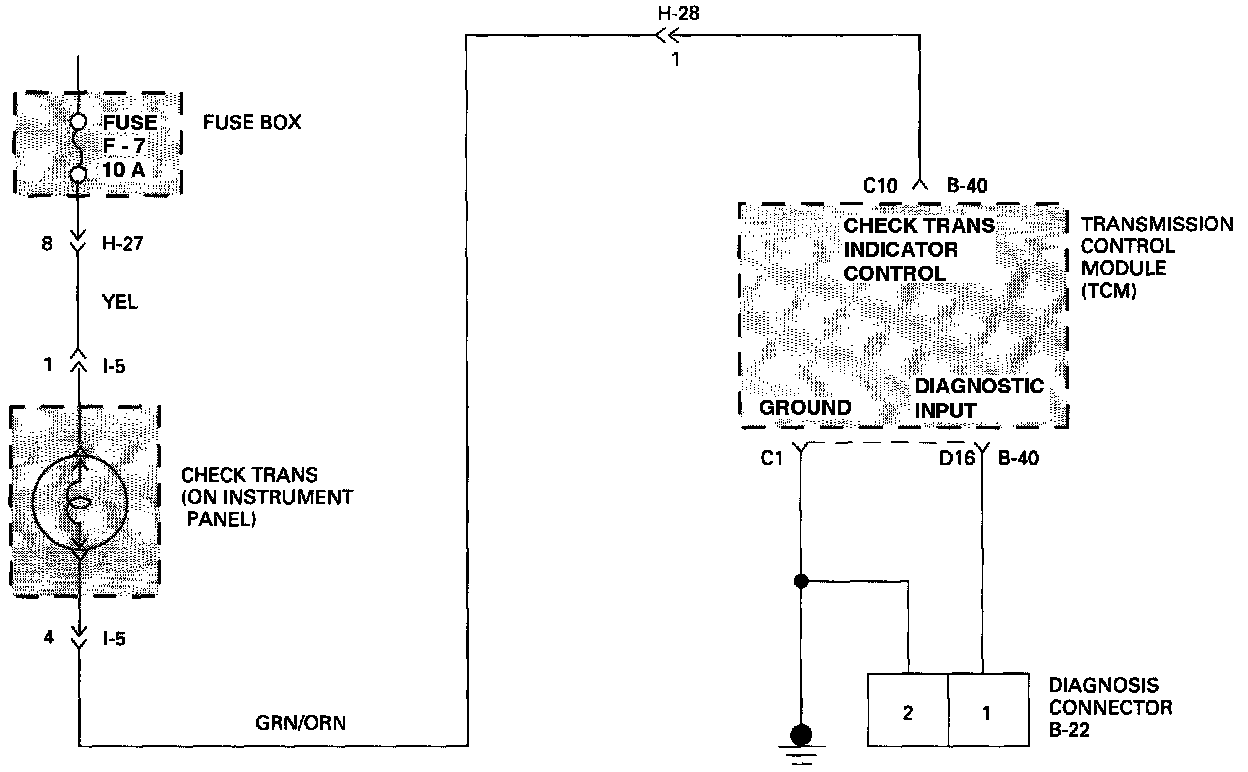 a. This means that the Transmission Control Module (TCM) is in flashing code mode. This mode is only used for service. This mode is set when the Terminal 1 of diagnostic connector B-22 is connected to ground. To go out of this mode, see image.