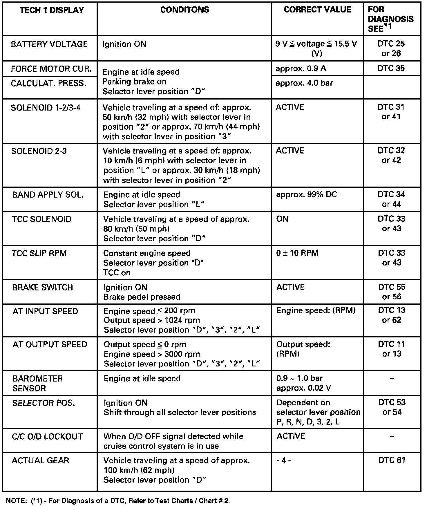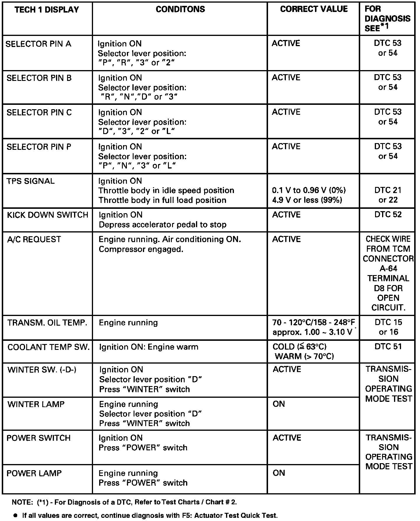 The purpose of the FO: Data List mode is to continuously monitor data parameters. The current actual values of all important Sensors and signals in the system are displayed through Mode FO. The displayed actual values must then be compared with the specifications listed in the checking instructions. From these the trouble can be clearly diagnosed. In the Quick Check list, all the test steps are summarized, so that (for example), after a mechanical/hydraulic problem, the electronic functions can also be quickly checked.
