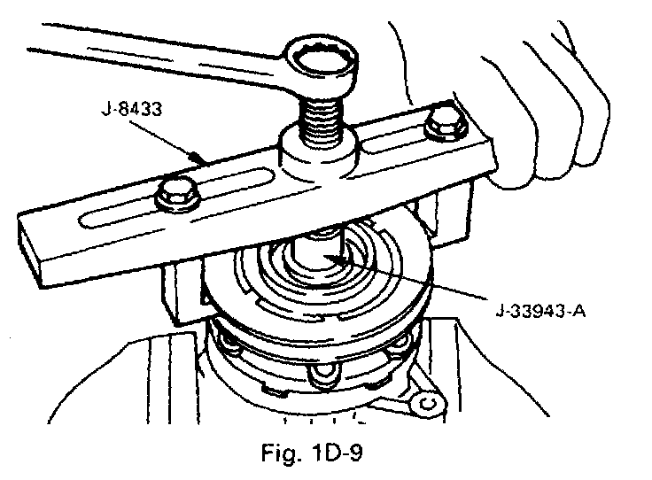 - Using drive plate puller (J-33944-A) and forcing screw (J-33944-4) to remove the drive plate.