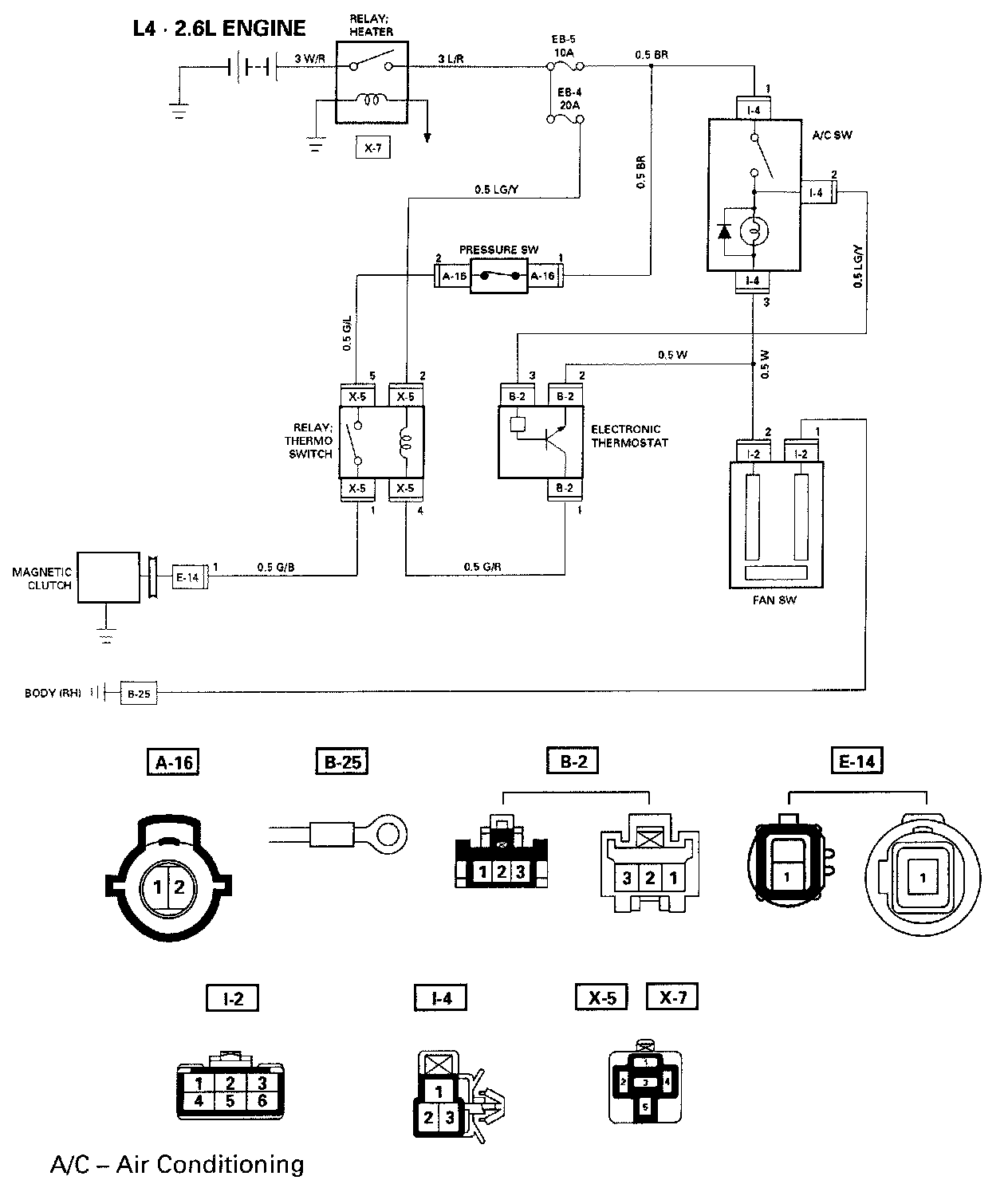 When the air conditioning switch and the fan control knob (fan switch) are turned on with the engine running, current flows through the thermo switch (and the compressor) relay(s) to activate the magnetic clutch.