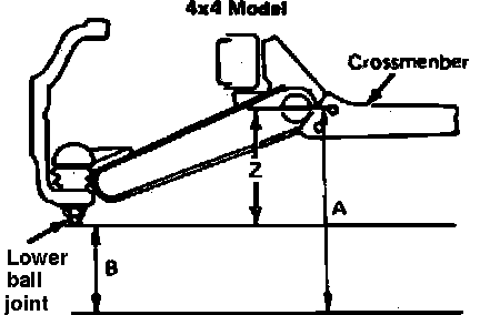 Vehicle height is adjusted by an adjusting bolt on the control arms. Before adjusting trim height, check tire pressure and ensure vehicle is on level ground.Fig. 5 Ride height measurement points. 4WD models: