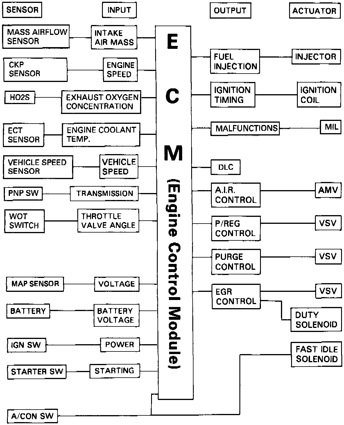 The Engine Control Module (ECM) receives the voltage signal from the Heated Oxygen Sensor (HO2S) and generates a controlling signal to the fuel injectors to control Air Fuel ratio near stoichiometry.