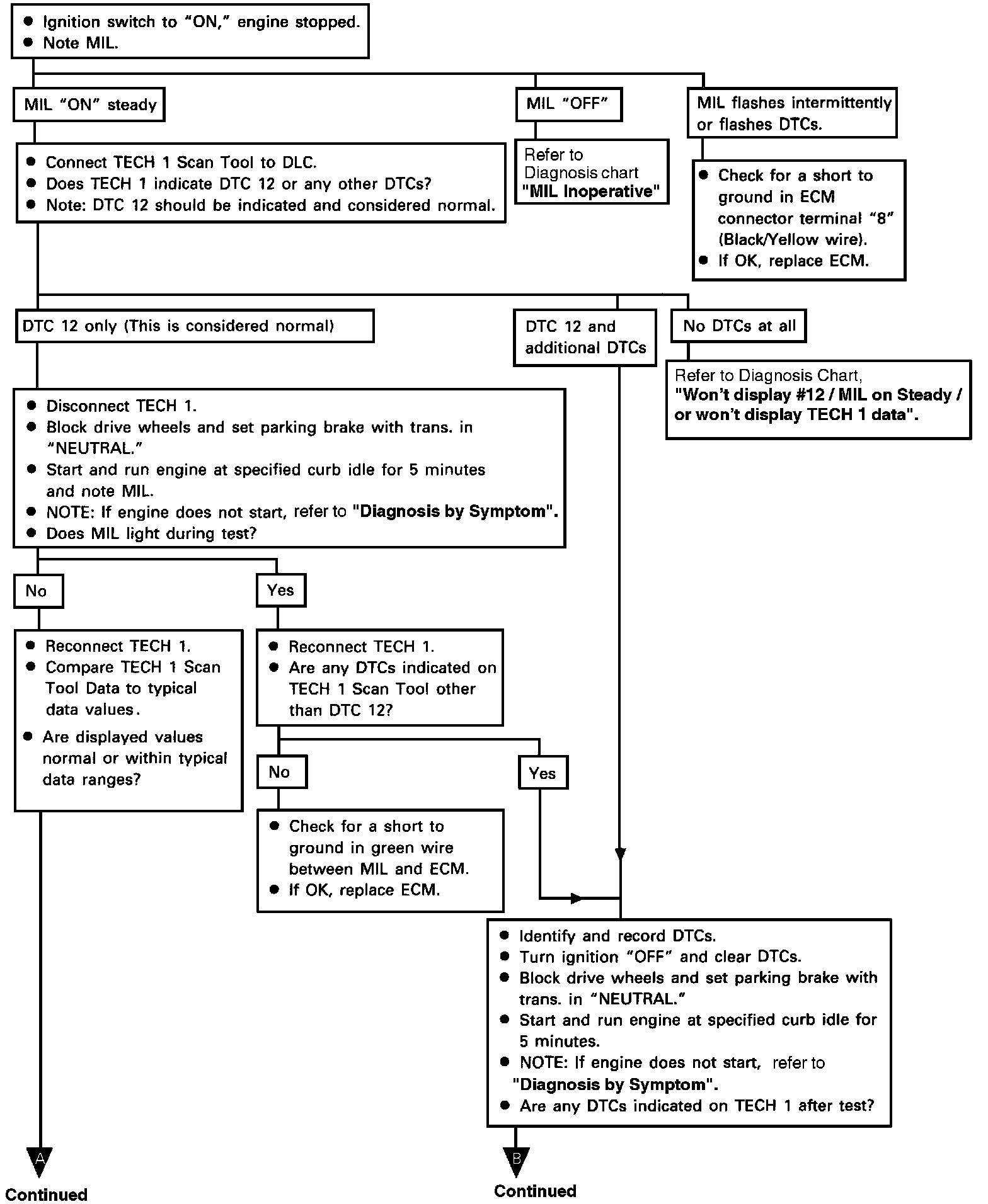 2. Connect the Diagnostic Trouble Code (DTC) Test Terminals with each other, near ECM connector. The ECM will cause the MIL to flash DTC 12, indicating that the ECM diagnostics are working. DTC 12 will flash three (3) times, followed by any other DTCs stored in the memory. Each additional DTC will flash three (3) times, starting with the lowest DTC and then start over again with DTC 12. If there are no other DTCs, DTC 12 will flash until the DTC Test terminals are disconnected or the Engine is started. If a TECH 1 Scan is available, it can be connected to the Data Link Connector (DLC), also located by the ECM, to obtain DTCs.