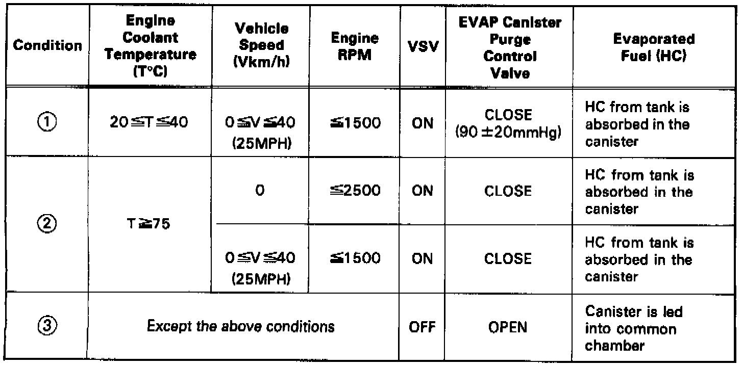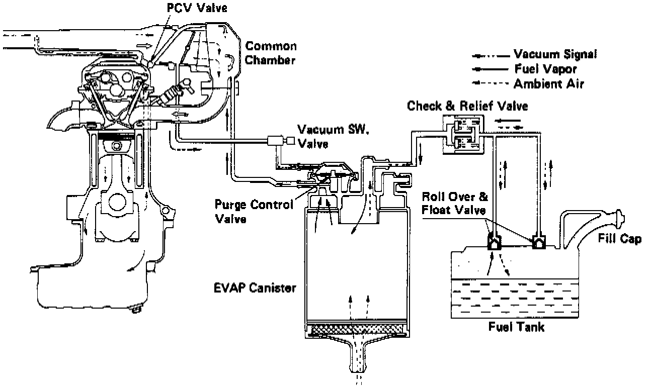 This system of vapor recovery consists of the fuel tank and filler cap, a check & relief valve, two roll-over & float valves, a vacuum switching valve and charcoal EVAP canister with integral purge control valve.